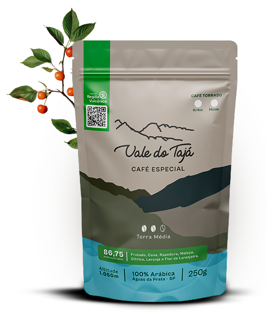 Na altitude das montanhas, cercadas pela vegetação da Mata Atlântica e por nascentes de águas cristalinas, floresce o Café Vale do Tajá.